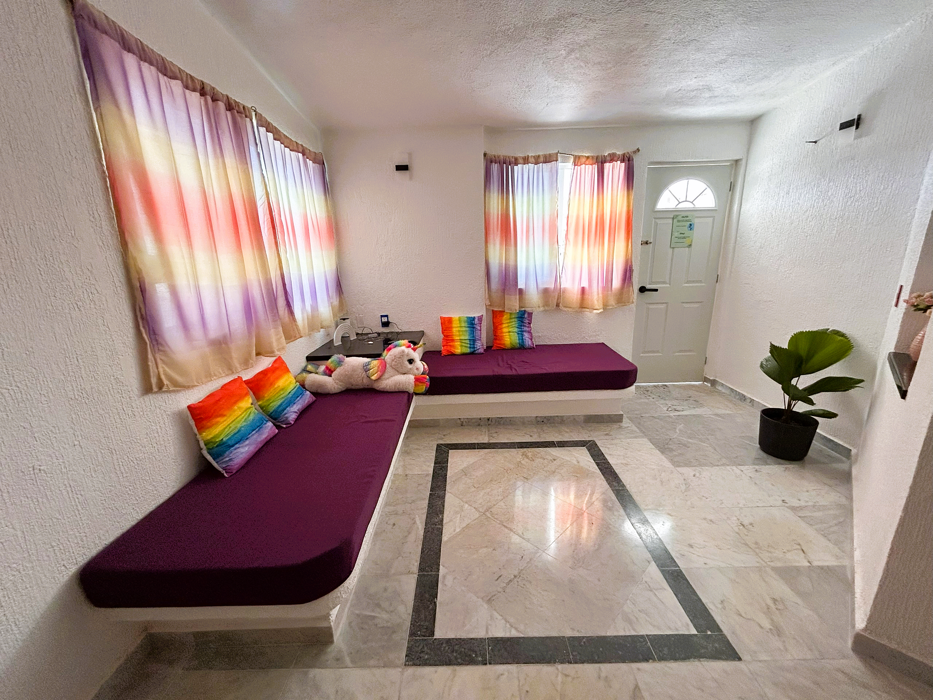 Decorated with rainbow themes and a very cheerful touch, you can enjoy a spacious villa that has a bedroom with a king size bed and a full bathroom, a living room, a dining room, and if saving is your thing, you will have a kitchen equipped with the essential utensils to make some meals. without having to go out to restaurants, ideal for your breakfasts and/or dinners.