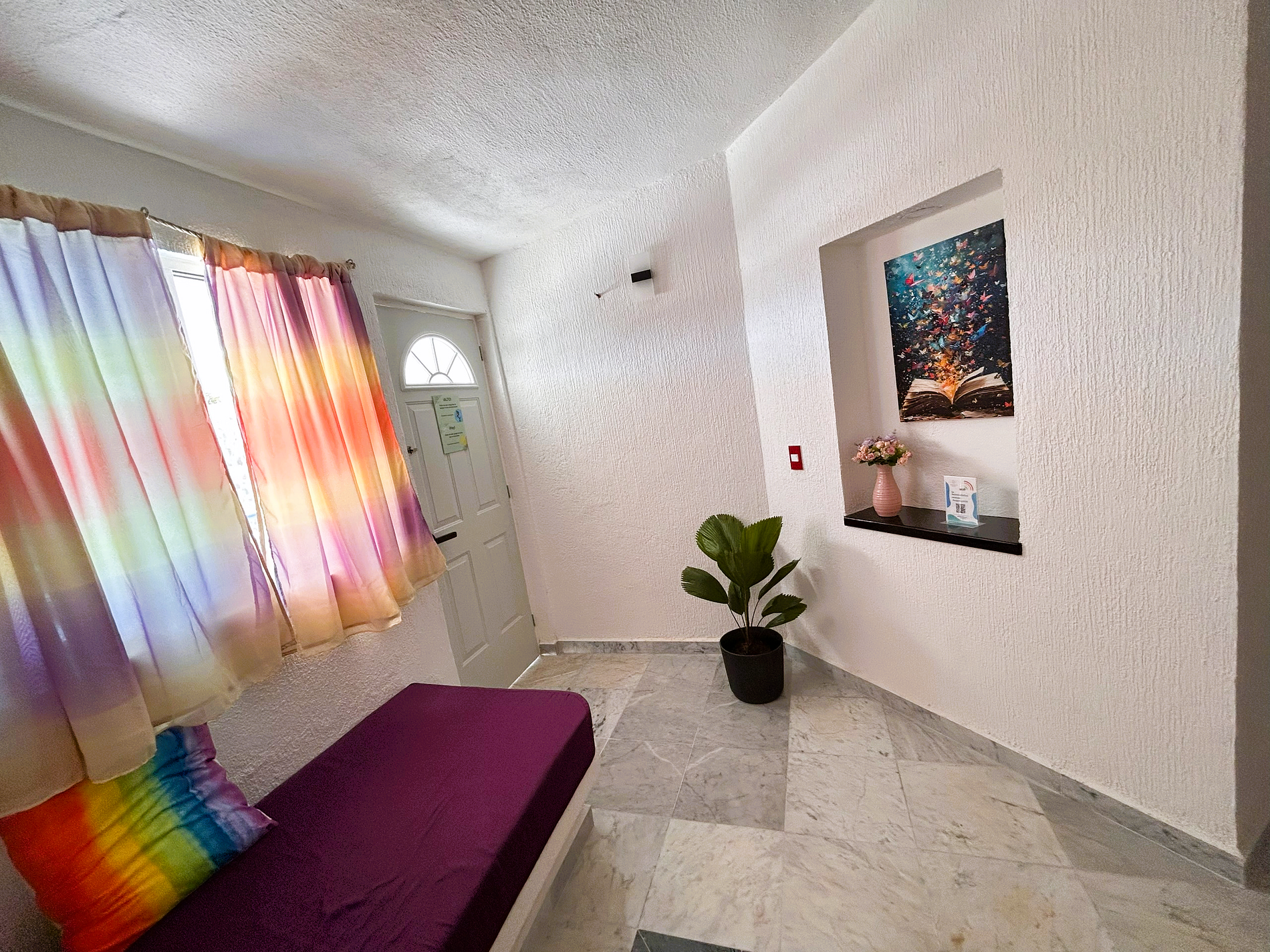 Despierta con la vista del mar y disfruta de una estancia confortable en nuestra villa Arcoíris que cuenta con 1 habitación y un baño completo. Relájate por la tarde desde su terraza mientras disfrutas de un bello atardecer y de las increíbles vistas del océano. Nuestra villa es muy amplia y permite alojar cómodamente hasta 4 adultos. Te sentirás como en casa al contar con una cocineta equipada que te permitirá realizar tus desayunos o cenas para disfrutar con tu familia o amigos.